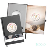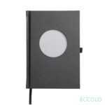 The front cover features a circular die-cut window that reveals your printed logo on the inside journal page. Opening on the cover is 3″ in diameter. The Eccolo® Zorba Journal features: 256 lined pages. Lay-flat binding A matching bookmark ribbon. Pen loop. Un-dated calendar. Perforated pages.